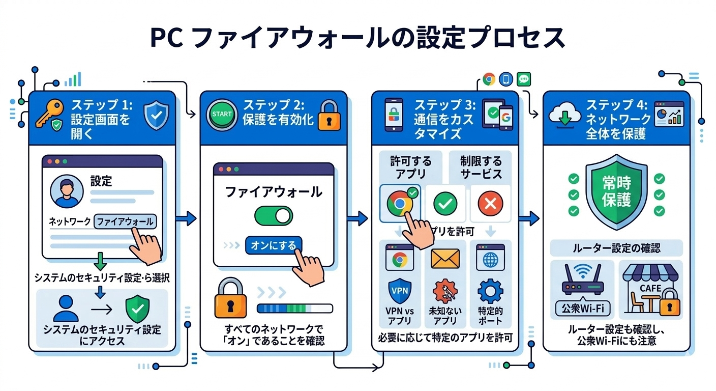 ファイアウォールは、外部からの不正なアクセスや、内部からの情報流出を防ぐ重要な防御手段です。多くのOSでは標準で搭載されていますが、設定がオフになっているケースもあるため、必ず有効状態にしておきましょう。