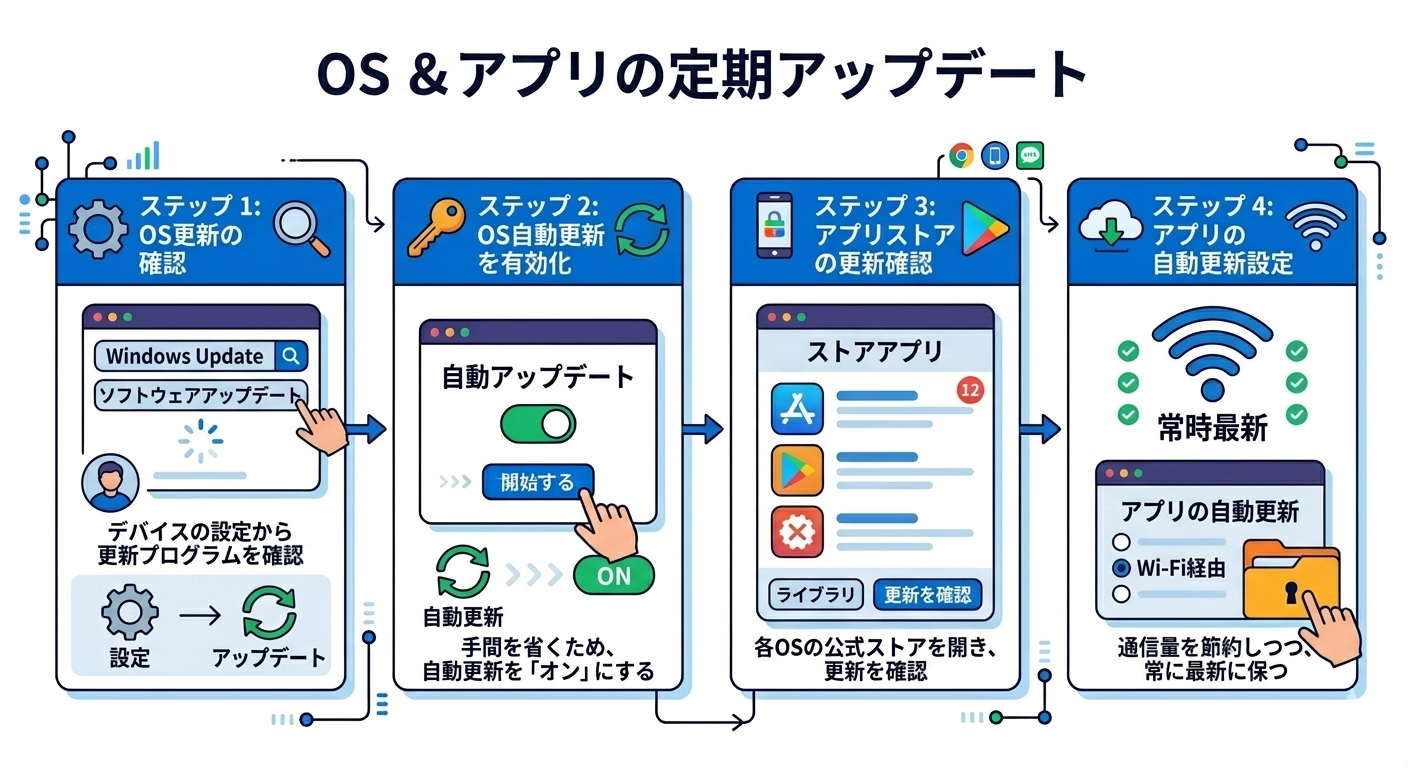 OSやアプリケーションの定期的なアップデートは、脆弱性を悪用した攻撃への最も有効な対策です。新たなセキュリティホールが発見されるたび、開発元から修正プログラムが配信されます。
