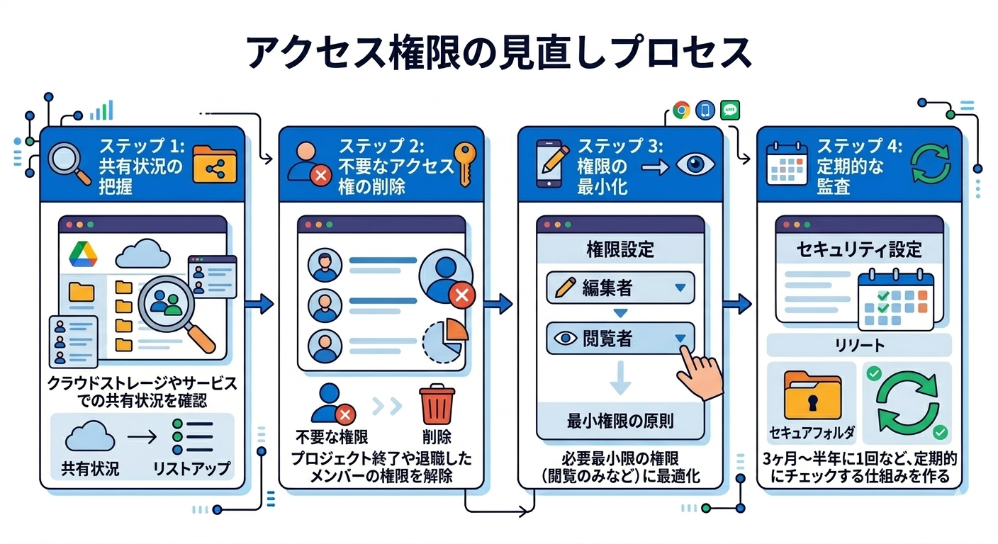 パソコン内のフォルダやファイルには、アクセスできるユーザーやグループが細かく設定されています。不要なユーザーに権限が付与されていないか、新たに利用者が増えた場合は適切な権限付与が行われているか、定期的に見直すことが安全性向上に直結します。