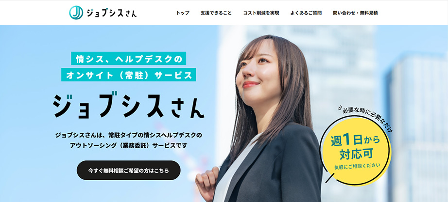 | サービスの特徴 | ・情シス・ヘルプデスクのオンサイト(常駐)に特化したアウトソーシングサービス ・PC設定やトラブル対応、システム運用、社内インフラ管理など幅広い業務に対応 ・属人化を防ぐ複数名体制での常駐支援 ・契約期間は1か月単位から柔軟に設定可能 ・ISO27001を取得 |